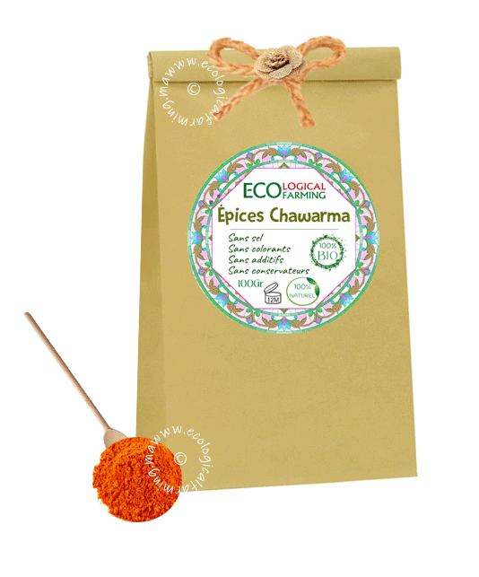 Notre ÉPICES CHAWARMA est produit à partir de nos épices Marocaines de culture biologique, cueillies et triées à la main, séchées au soleil et fraîchement moulues à froid sur commande.